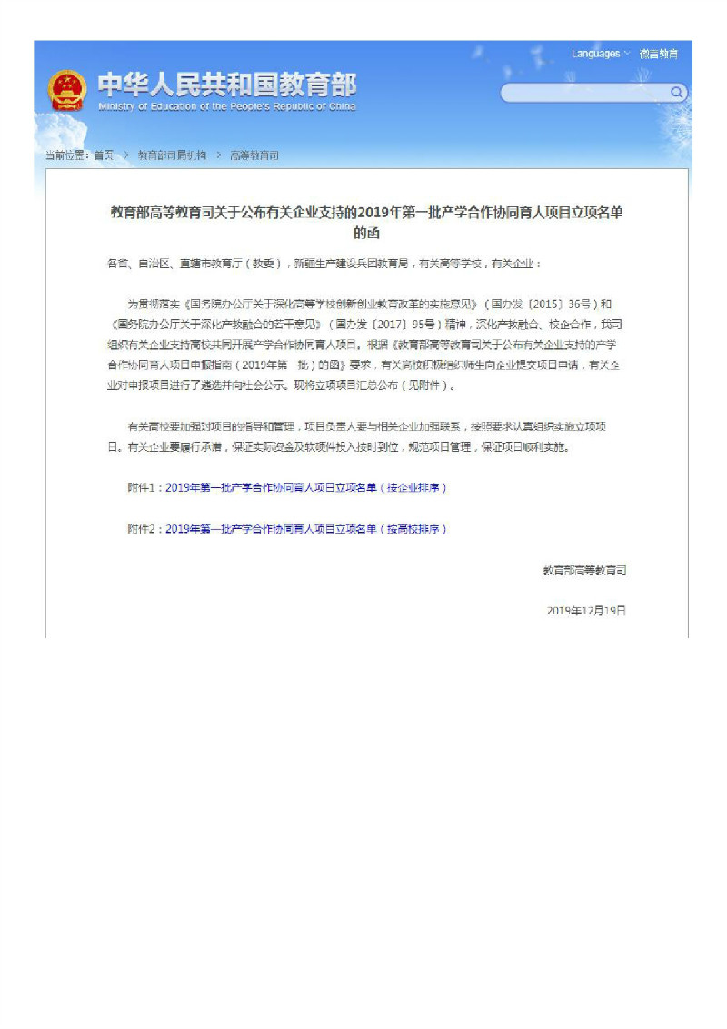 教育部高等教育司关于公布2019年产学合作协同育人项目立项名单
