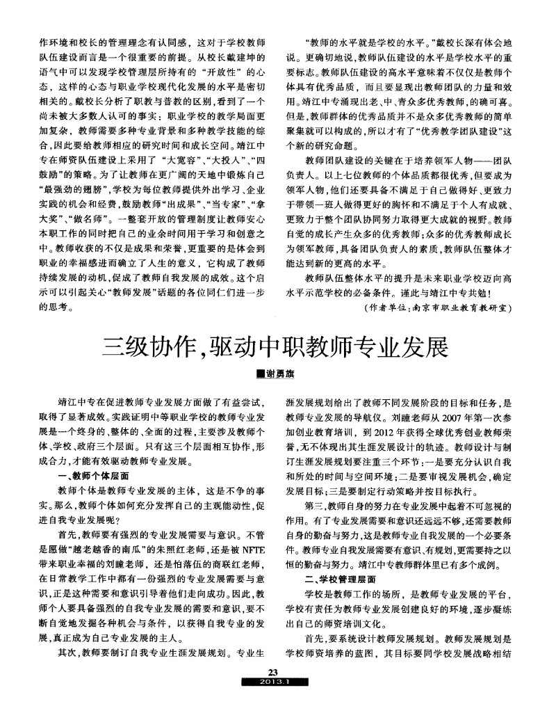 三级协作,驱动中职教师专业发展